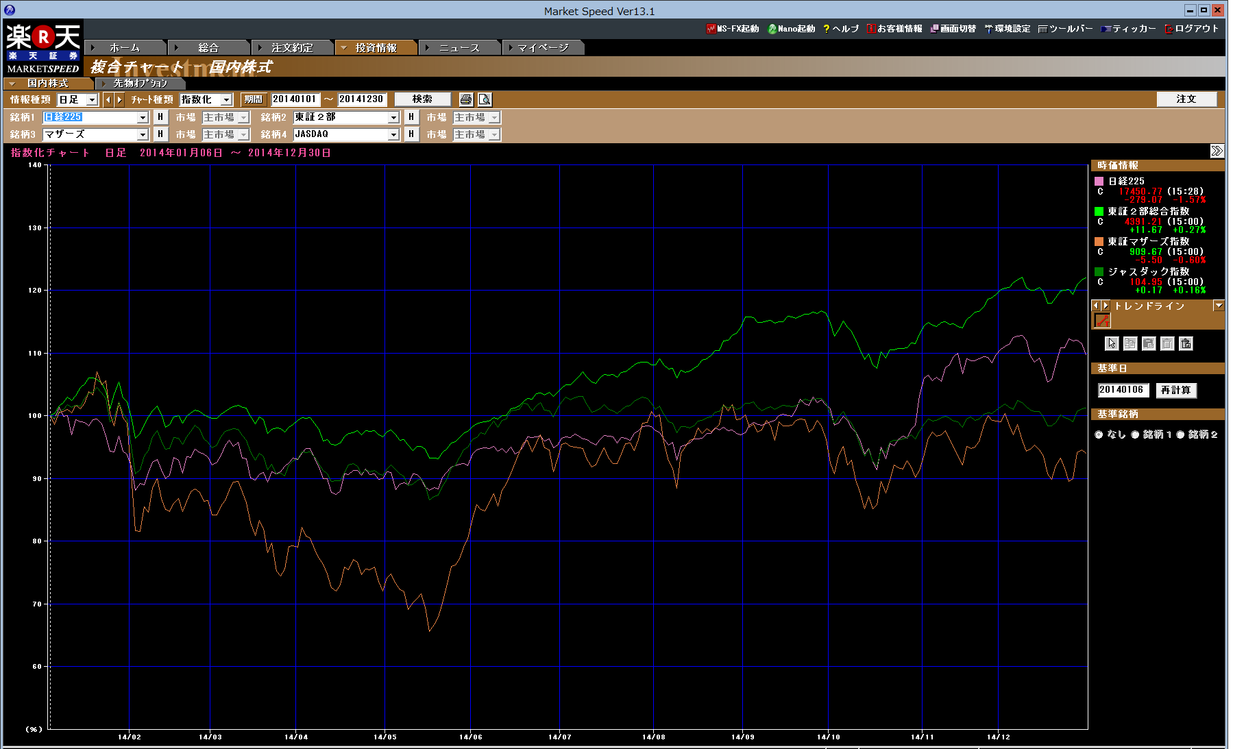 ちょっと全体的な話になるが今年の傾向としてボロ・低位株の強さが際立ち、12月はそれを象徴する月だったと思う。上の図は年初を100と指数化した場合での日経平均、東証二部、マザーズ、JASDAQのチャートだ。これをみると日経平均も10%ほど上昇したことが分かるが、20%以上上昇した二部がダントツの強さだったことが分かる。ボロ・低位株はこの二部との連動性が高く、優待株もほぼこれに準ずる動きだったと思う。私が普段みている銘柄のチャートはほとんどこれだから体感的には日経平均が50%近くも上昇した去年より今年のほうが強く感じるのはそのせいかもしれない。