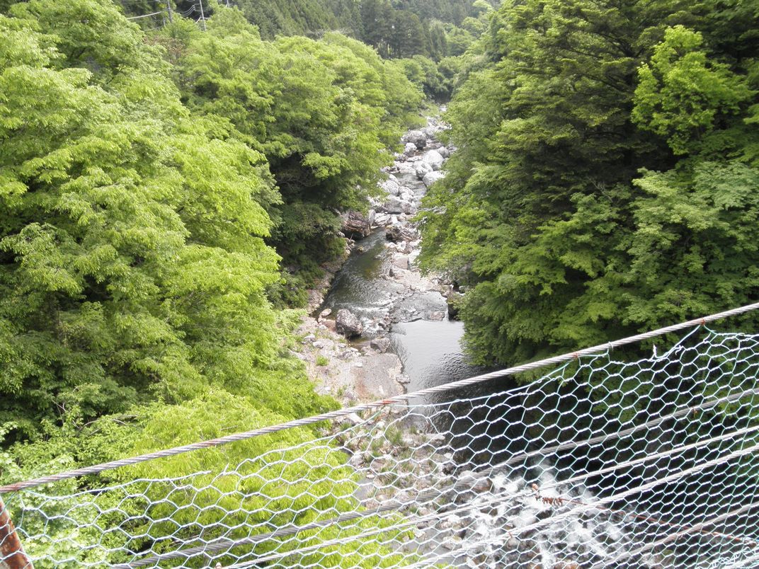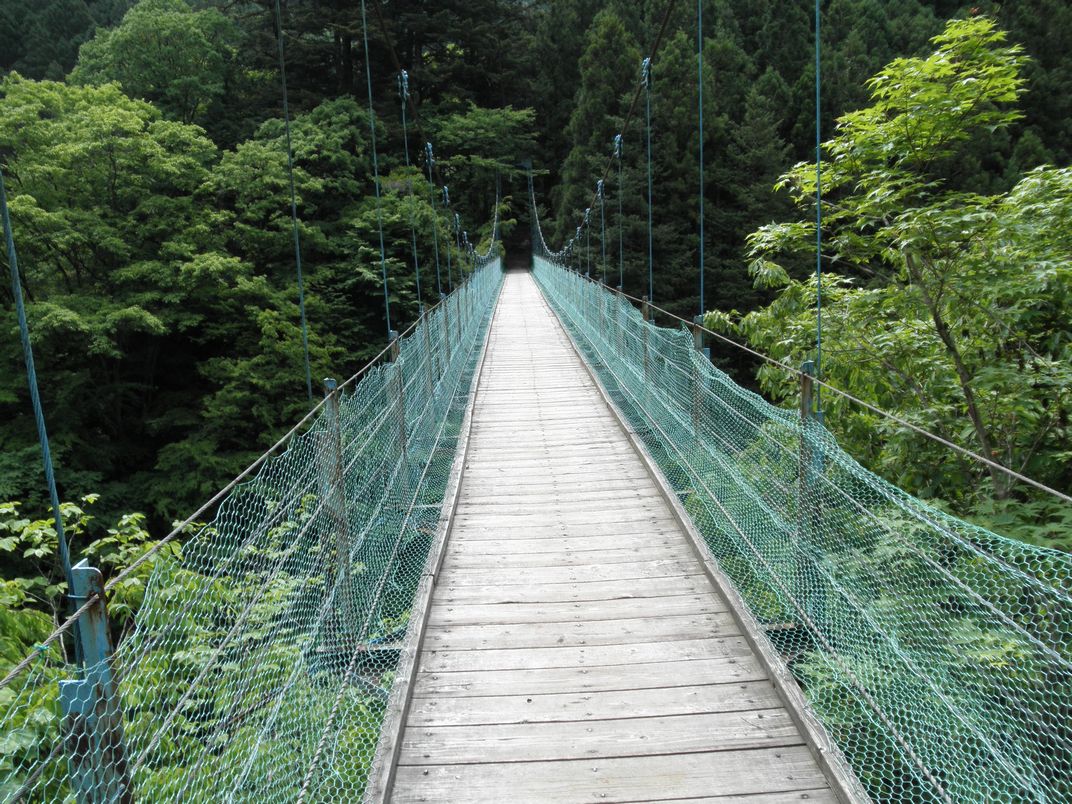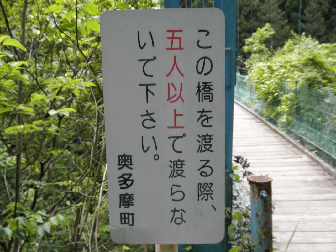 道中に吊り橋があった。看板には「5人以上で渡らないで」って書いてある。「5人以上と