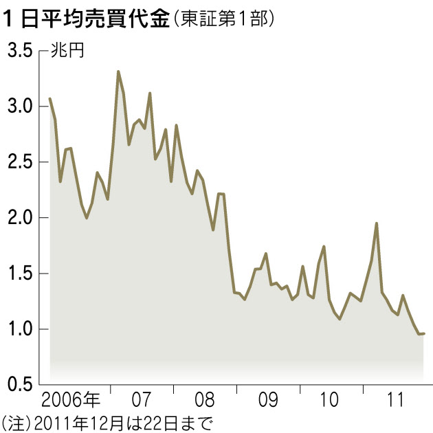 上のグラフは先日日経新聞に載っていたここ数年の東証一部の1日あたりの売買代金だ。